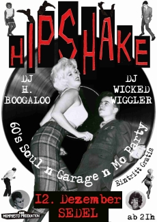 HIPSHAKE Party mit DJ WICKED WIGGLER und DJ H. BOOGALOO. Auf den Plattenteller kommen hauptsächlich Perlen aus den 60er-Jahren: Herzrasender oder herzerwärmender 60’s Soul, aggressiv dystopischer oder die Liebe verherrlichender 60’s Garage, schick angezogener 60's Mod-Beat oder die Badehose feiernder 60's Surf. Wer nicht auf den Socken nach Hause laufen will, dem werden dicke Schuhsohlen empfohlen. Zwischendurch hat's natürlich auch noch Platz für all die anderen besten Outsider-Hits der vergangenen 70 Jahre: primitiver oder lasziver 50’s Rhythm & Blues und Rockabilly, Gitarrensolo fremder oder Gitarrensoli feiernder 70’s Punk, Garbage-Men oder Sex-Beat 80’s Garage-Indie bis zu Devo-Egg-Punk der heutigen Untergrund-Jugend und zwischendurch eine jodelnde Country-Nummer oder ein mit Überschall-Geschindigkeit rasendes Cajun-Akkordeon, dann noch Shingaling, Swamp, Hammond-Orgel-Instrumentals, Brain-Mash, Blues, Trash oder Ye-Ye. Kurz: Rock’n’Roll Party A-Go-Go. Nur Bahnhof gelesen? Dann am besten hier reinhören: